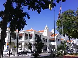 Between 1974 and 1976, the George Town City Council was merged with the Penang Island Rural District Council to form the Penang Island Municipal Council, while the five local authorities within Seberang Perai, including the Butterworth and Bukit Mertajam town councils, were merged into the Seberang Perai Municipal Council.[126] By then, local elections, suspended since 1965, became a thing of the past, with the municipal councillors being appointed by the Penang state government ever since.[106] The merger of the local governments on Penang Island also led to a decades-long dispute over George Town's city status.[127][128]