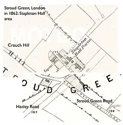 In effect, modern-day Stroud Green dates from the 19th century. New building at first was slow, perhaps partly because of poor sewerage, until the 1860s. Stapleton Hall remained the only house in Hornsey between Crouch End and Seven Sisters Road as late as 1861, but the streets of Islington were fast approaching towards Stroud Green Road, along the east side of which now stood several large houses. Rapid growth followed the opening of local stations at Seven Sisters Road (Finsbury Park), Crouch Hill, and Crouch End, as well as the new Stroud Green station.