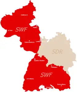 The southwestern part of Germany was at the time was split after the end of World War II into two occupation zones, an American and a French one and each of these two broadcasters operated in the subsequent two German States of Baden-Württemberg and Rhineland-Palatinate. In 1998, the SDR and SWF merged into a single unified Südwestrundfunk (SWR).[1] The German word Rundfunk means broadcasting (corporation), and the ending "-funk" in Südwestfunk and Südfunk is short for Rundfunk, or means 'radio (program)'.
