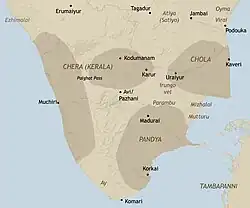 The Cheras were an ancient Dravidian royal dynasty of Tamil origin who ruled in regions of Tamil Nadu and Kerala in India. Together with the Chola and the Pandyas, it formed the three principal warring Iron Age kingdoms of southern India in the early centuries of the Common Era. over a wide area comprising Venad, Kuttanad, Kudanad, Pazhinad, and more. In other words, they governed the area between Alappuzha in the south to Kasargod in the north. This included Palghat, Coimbatore, Salem, and Kollimalai. The capital was Vanchi, which the Romans who actively traded with the Cheras knew as Muzris.