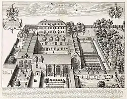Bathurst's plan, executed over some thirty years, involved the regeneration of a number of Trinity's buildings, including the early fifteenth-century chapel (which was rapidly becoming structurally unsound), and the Old Bursary, which became a common room.[7] The old kitchen was similarly replaced in 1681, and the President's lodgings refurbished.[9] The chapel, consecrated in April 1694 and requiring two loans to complete, is the only collegiate building to appear on the itinerary of Peter the Great during his trip to Oxford, though it is unclear whether he set foot inside it. Also constructed was a separate building – designed, like the final flourish of the chapel's design, by Sir Christopher Wren – forming the northern side of what is now the college's "Garden" quadrangle.[7][9] Having raised funds from Trinity's alumni and fellows to settle the £1,500 construction costs, the new block was ready for use by 1668, though the room interior fittings were added gradually by their occupants.[9] Bathurst's continuing desire for expansion precipitated in the creation from 1682 to 1684 of an identical block, which now forms the western side of the Garden quadrangle,[7] as well as an eponymous "Bathurst building", pulled down in the late nineteenth century.[9]