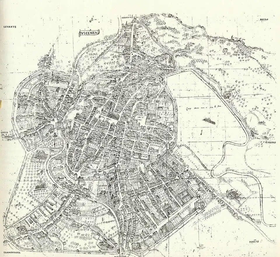 Compared to the current city’s extent, the Roman settlement was modest, roughly corresponding to the historic center in the strict sense: to the west, it began at the current Porta Castello; to the north, at the intersection of Contrà Porti-Apolloni-Pedemuro San Biagio; to the east, at the start of Corso Palladio from Piazza Matteotti; and to the south, where Contrà della Pescheria and Contrà di San Paolo meet. It was bordered on three sides by rivers, the Astico (now Bacchiglione) and the Retrone, crossed by two stone-arched bridges—described and drawn by Palladio—corresponding to the current Ponte degli Angeli and Ponte San Paolo, replaced by modern structures in the second half of the 19th century.[21]