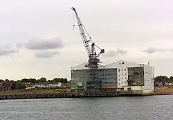 The Royal Navy also had a large building situated between Archery Road and the waterfront[12] which they used as stores. Originally built in 1917 by the Ministry of Munitions as Rolling Mills for the production of brass strip for shell cases, this building is often thought of and referred to as being within Woolston but it was actually in the neighbouring district of Weston.[1][3] It was built immediately behind Weston Grove House[1] on land that was originally part of the Weston Grove estate.[13]