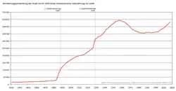 - ^ 1962: 440,180 (maximum); 1980: 370,618; 1989: 355,901 (minimum); 1990: 356,352; 1995: 360,826; 2000: 360,980; 2005: 366,809; 2010: 385,468; January 2014: 400,028 (31.7% foreigners) stadt-zuerich.ch
