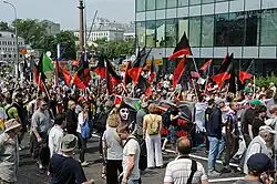 By the 1960s, the IWA had declined to its lowest point, as anarcho-syndicalists became largely preoccupied with providing theoretical analyses of new developments in both capitalist and socialist states.[169] It was only after the protests of 1968 and the Spanish transition to democracy that the anarcho-syndicalist movement began to experience a revival. The CNT once again rose to prominence in Spain,[170] growing to represent 300,000 members by the end of the 1970s, but it ultimately failed to become a leading force in the post-Francoist period.[171] Meanwhile, new anarcho-syndicalist organisations were established in countries throughout Europe.[169] During the 1980s, globalisation and neoliberalism led to the dismantling of welfare states in the West, while the Eastern Bloc collapsed in the Revolutions of 1989.[172] This caused a crisis in left-wing politics, as social-democratic parties adopted neoliberalism and mainstream trade unions were unable to prevent the worsening of living and working conditions, with many workers facing increased precarity.[173] Anarcho-syndicalists considered this to be a moment that demonstrated the problems inherent to capitalism and the state,[174] and once again began to present libertarian socialism as a necessary alternative to the existing system.[175]
