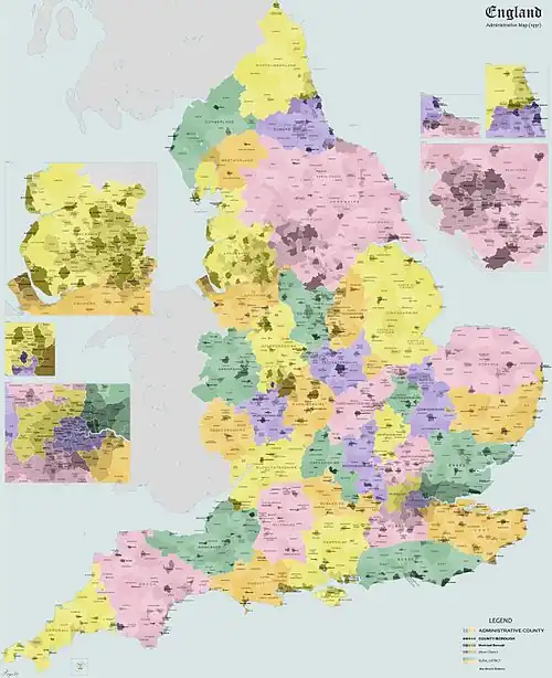| Second tier | Urban district (Called metropolitan boroughs in London) (Both) |