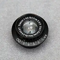 The Tessar was the standard high-quality, moderate-aperture, normal-perspective lens of the twentieth century. The Kodak Anastigmat Special 100mm f/3.5 on the Kodak Super Six-20 (1938, USA), the first autoexposure still camera, was a Tessar,[36] as was the D. Zuiko 2.8 cm f/3.5 on the Olympus Pen (1959, Japan), the original Pen half frame camera;[37] the Schneider S-Xenar 40mm f/3.5 on the late version of the Rollei 35 (1974, West Germany/Singapore);[38][39] and the AF Nikkor D 45mm f/2.8P Special Edition for the Nikon FM3A (2001, Japan), the last manual focus 35mm SLR released by a major maker.[40] It was fitting that the Zeiss Stiftung's last camera, the Zeiss Ikon S 312, had a Zeiss Tessar 40mm f/2.8 (1972, West Germany).[41]