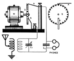 The first crude device that did this was the tikker, invented in 1908 by Valdemar Poulsen.[28][76] [78] This was a vibrating interrupter with a capacitor at the tuner output which served as a rudimentary modulator, interrupting the carrier at an audio rate, thus producing a buzz in the earphone when the carrier was present.[79] A similar device was the "tone wheel" invented by Rudolph Goldschmidt, a wheel spun by a motor with contacts spaced around its circumference, which made contact with a stationary brush.