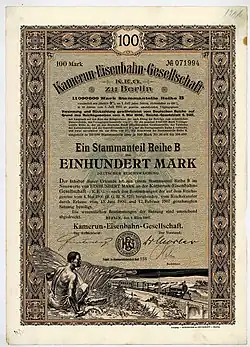 The second railway to be built in Cameroon was the 160-kilometre-long (99 mi) Douala–Nkongsamba railway, also known as the Northern Railway (Nordbahn), was built between 1906 and 1911 from Bonabéri (opposite Douala on the Wouri estuary) to Nkongsamba.[2] The Cameroon Railway Corporation (German: Kamerun-Eisenbahn-Gesellschaft) was created for this purpose in 1906. The third railway was the Douala–Ngaoundere railway, also known as the Central Railway (Mittellandbahn). These two lines were built in 1,000 mm (3 ft 3+3⁄8 in) metre gauge and set the standards for future railway construction in Cameroon.