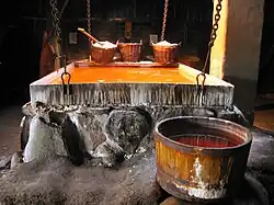 One of the traditional methods of salt production in more temperate climates is using open pans.[28] In open-pan production, salt brine is heated in large, shallow open pans. The earliest examples of this date back to prehistoric times and the pans were made of either a type of ceramic called briquetage, or lead. Later examples were made from iron. This change coincided with a change from wood to coal for the purpose of heating the brine.[29] Brine would be pumped into the pans and concentrated by the heat of the fire burning underneath. As crystals of salt formed, these would be raked out and more brine added.