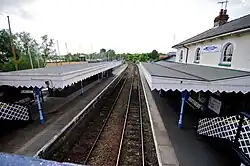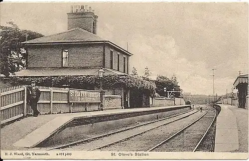 St Olaves station was situated some distance north of the point of intersection, and there were two stations named St Olaves Junction at the intersection, "High Level" on the ESR and "Low Level" on the Lowestoft Railway.[23] These were only exchange platforms and had no access from the public road.[5]