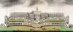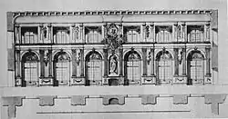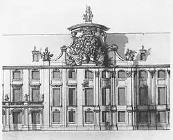 The next reconstruction project of the Royal Castle appeared after Augustus III took to the Polish throne in 1733. New plans, which were formed in 1734 and developed in 1737 by architect Gaetano Chiaveri, saw among other things, the reconstruction of the castle's façade on the Vistula side in the rococo style, which was meant to form a new so called Saxon elevation and also the conversion of the north-east part with the Altana Tower, where it was planned for 3 two-storey rysalits to be built on.[6][10] The reconstruction work according to these plans was carried out with various intensity between 1740 and 1752. During the period of 1740-1747 the façade on the Vistula side was reconstructed in the late baroque style (architects: Gaetano Chiaveri, Carl Friedrich Pöppelmann, Jan Krzysztof Knöffel).[10] One of the best sculptors who did work on the castle in this period was Jan Jerzy Plersch, who made the royal decorative frames, mouldings and statues called the Famous Figures, which held the royal crowns on the top of the middle rysalit, of the Saxon elevation, on the Vistula side. The last reconstruction work of this period was finished by late 1763, after the death of Augustus III, when Plersch made the last sculptures and frames with province emblems for the Parliament Hall.[10]
