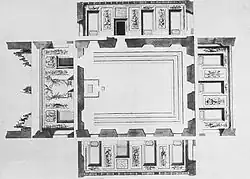 During 1766–1785 on the basis of Jakub Fontana's plans,[3] the southern wing of the castle, which was burnt on 15 December 1767 was rebuilt (2 destroyed floors, a new elevation on the south side with three rysalits, the division of the façade by lizens and Jon capital pilasters).[6] Between 1774 and 1777 the monarch's private apartments were furnished.[6] They consisted of the Prospect Room (with landscapes by Canaletto), the chapel, the Audience Chamber, and the Bedchamber, while between 1779 and 1786 the Senate Apartments were completed, consisting of the Ballroom, the Knights Hall, the Throne Room, the Marble Room, and the Conference Chamber.[4] These rooms contained pictures and sculptures depicting great events in Poland's history, as well as portraits of Polish kings, generals, statesmen and scholars (including Copernicus and Adam Naruszewicz).[3] The Castle also housed the rich royal collections including 3200 pictures, classical statues, about 100 000 graphics, in addition to medals, coins, and a fine library, to house which a separate building was erected in 1780–1784.[11] The new library building housed many books, gems, drawings, coins, maps and plans belonging to the monarch. The Royal Library's book collection amounted to 16 000 volumes of various works, 25,525 drawings, 44,842 etchings in 726 bound volumes, overall a number of 70,000 etchings—fancy dress balls were also held in this hall.[11]