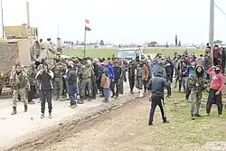 On 12 February, government supporters blocked and pelted a U.S. military convoy passing through Qamishli, which led to a clash with U.S. troops, killing one civilian and injuring another. There is no certainty as to whether the civilian who was killed was armed or not, a monitoring group stated.[48][49] Local sources and U.S. officials said that pro-Syrian government militiamen were also part of the stand off.[50] According to the coalition spokesman Col. Myles Caggins, the coalition troops were compelled to exchange fire in an act of self-defense and that the incident is under investigation.[51]