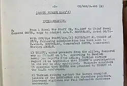 The Turkish Navy was the weakest of the services. It consisted of the outdated battle cruiser Yavuz (ex-Goeben), 4 destroyers, 5–6 submarines, 2 light cruisers, 3 mine-sweepers, 2 gunboats, 3 motor torpedo boats, 4 minelayers and a surveying vessel.[18][19] The personnel strength was approximately 800 officers and 4,000 men.[20] The Navy lacked all modern appliances for defending coasts and harbours, and the ships were defenceless against air attacks.[18]