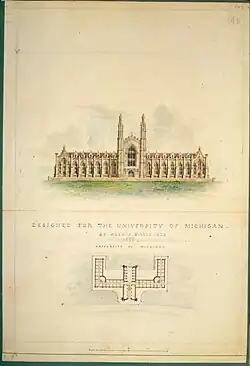 Tappan modeled the university's curriculum on the broad range of subjects taught at German universities (the so-called "research model"), rather than the classical models (the so-called "recitation model"). To that end, Tappan enlarged the library, and supported the development and establishment of laboratories, an art gallery, and the Detroit Observatory.[22] However, Tappan was dismissed in 1863 over conflicts with the Board of Regents concerning matters of policy and personality.[23]