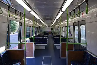 Beginning in 1992, the Hitachi fleet received internal, external, and cab upgrades, at the PTC's Ballarat North and Bendigo Workshops.[9] The refurbishment included the replacement of existing rubber or carpet flooring with vinyl, the replacement of panels above the seats with a new anti-vandal material, and the substituting of the wood-grained upper panels and bone-coloured roof with off-white panels. New seat pads were provided on repainted and strengthened seat modules, luggage racks and advertising boards were removed, windows and doors overhauled, including the door-closing motors worked by air, along with a general clean of the exterior and the application of new green and gold stripes.[9] The refurbishment of over half of the Hitachi M cars also included improved air-flow in the driver's cab and double-thickness windscreens, with aluminium replacing the original rubber surrounds. The work on the M cars had been completed by early 1994.[9] After the upgrades were effected, M cars which had not been upgraded were no longer allowed to lead a train in revenue service, effectively making them B units.