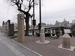 The Matsue Ohashi Bridge according to legend used a human sacrifice in its construction. The nearby park is named Gensuke in honour of the human sacrifice along with a memorial dedicated to the victims who died during the bridge's construction.