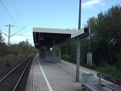 Hochdahl-Millrath station is a through station in the district of Millrath of the town of Erkrath in the German state of North Rhine-Westphalia. The station was opened in 1968 or 1969 on the section of the Düsseldorf–Elberfeld railway from Erkrath to Wuppertal-Vohwinkel that was opened by the Düsseldorf-Elberfeld Railway Company on 10 April 1841.[6] It has two platform tracks and it is classified by Deutsche Bahn as a category 5 station.[1]