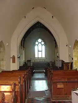 The chancel measures 9 metres (30 ft) by 5 metres (16 ft). It has a cornice decorated with ballflowers. Along its south wall is a bench, a double piscina dating from the 14th century, and a triple sedilia; these are decorated with ballflowers, crockets and leaf finials.[1] The carving is of high quality, and was probably paid for by Henry de Gower, Bishop of St David's.[3] The chancel is floored with encaustic tiles. The restored east window is in Decorated Gothic style; the other windows in the chancel are in simpler style. The nave measures about 12 metres (39 ft) by 5 metres (16 ft) and it contains a Norman font. The ground floor of the tower is used as a vestry.[1] The bells date from the 15th and 16th centuries.[2]