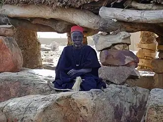 A hogon is a religious figure as well as a temporal authority;[1] the hogon may be hereditary or may be chosen from among the village elders—custom varies from place to place. The hogon is always a man. After being chosen, a hogon must pass through several months without washing or shaving. After initiation, he wears a red cap, and a pearl bracelet. Hogon live alone and should be celibate, but a village girl may act as a maid. Nobody should touch the hogon.[2]