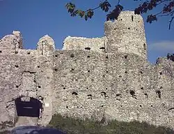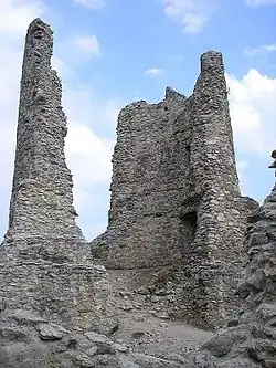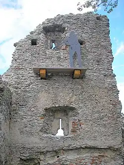 Two domestic buildings stood in the castle courtyard, which were joined together forming an angle with one another. The square walls of the smaller one have partially survived, the outer wall of the larger building was also the enceinte of the original castle, but the east wall has disappeared. At the southwest corner the round, vaulted, chapel tower has survived.