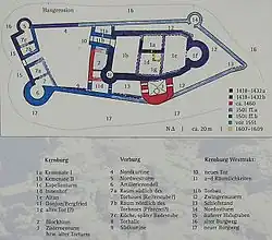 The bergfried forms the eastern enclosure of the inner bailey with its balcony in front. The zwinger wall makes an acute angle around the eastern end of the inner bailey. In the northeast of the zwinger a round defensive tower rises from the line of the wall.