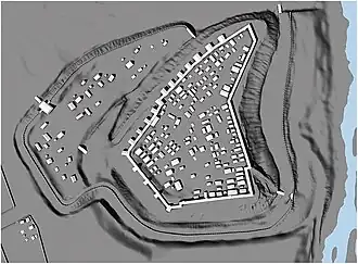 The main settlement on the citadel underwent several changes during its existence. As the houses were built of wood and daub, and the fortifications mostly of wood and earth, they were replaced frequently. This resulted in over a dozen identifiable occupation phases, representing at least 250 years of activity.[12]