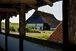 The citadel contained a regular system of streets and houses. It appears that the settlement underwent a major reorganisation after 600 BC, after which the dwellings were much more densely and regularly spaced than before.[16] At all times, the Heuneburg houses are of remarkably large size and elaboration compared to contemporary settlements. The uniform buildings probably served as dwellings and workshops. There is evidence for an active metal industry, including a bronze workshop in the southeast corner of the citadel.[17] After the 530 BC destruction of the mudbrick wall, the internal arrangements underwent some changes. The workshops were moved to the north. A very large house (14 by 30 m [46 by 98 ft]) was built in the southeast corner. This is sometimes interpreted as a Herrenhaus, i.e. the dwelling of a local ruler.[17]