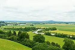 The fortified citadel measures about 300 by 150 m (980 by 490 ft). It stood on a strategically positioned mountain spur that rises steeply 40 m (130 ft) above the Danube. It is at the centre of a fertile river plain, surrounded by rolling hill country. During the Iron Age the Heuneburg is thought to have controlled a surrounding area of over 1,000 km2 (390 sq mi) including other hilltop settlements, hamlets, villages, roads, cemeteries and cult or gathering places.[1]