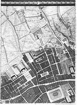 The now buried River Fleet formed the historic eastern boundary of the ancient parish of Holborn, a course now marked by Farringdon Street, Farringdon Road and other streets.[2] The northern boundary with St Pancras was formed by a tributary of the Fleet later known as Lamb's Conduit. The curving alignment of Roger Street follows part of the course of that lost brook, and marked the northern boundary of the parish and later borough.[29]