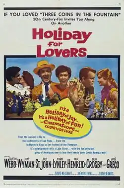 Holiday for Lovers is a 1959 American DeLuxe CinemaScope comedy film directed by Henry Levin. Based on a 1957 play of the same title by Ronald Alexander,[4] the film stars Clifton Webb, Jane Wyman, Jill St. John and Carol Lynley.