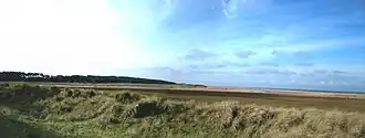From the main coast road Lady Anne's Drive, a toll road owned by the Holkham Estate, crosses the reclaimed salt marshes to Holkham Gap. This is a gap in pine-fringed sand dunes which form the outer coastline. From here, an uninterrupted sandy beach runs both ways to Wells and Burnham Overy Staithe. To the west of the gap is a nudist section of beach. Holkham railway station was located about halfway along Lady Anne's Drive (to the east). The railway line through to Holkham was built in 1864.[3] The line made up part of the Great Eastern Railway network, which ran from Wells-next-the-Sea, through Holkham and on to Burnham Market. The line was closed in 1952.[4]