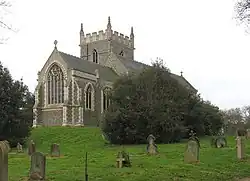 Holkham parish church is dedicated to Saint Withburga. This dedication to a Saxon saint often implies a church has Saxon origins. Excavations at Holkham have found Saxon remains near the west end which may be a tower. Norman remains have been found incorporated into the present building which implies that the Normans expanded the Saxon building – as they did at other churches. In turn this Norman church made way for an Early English building (13th century). The tower and the western part of the south aisle date from this period. The church guidebook notes that the tower gets progressively younger as it goes up. The lower section is Early English up to the sill of the belfry windows. The belfry itself is Decorated (14th century) while the battlements and pinnacles are Perpendicular (15th to 16th century). During restoration work at least six 12th and 13th century coffin lids with foliated crosses were found on site and are now on show inside the church.
