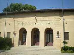 Julia Morgan designed the Studio Club in a Mediterranean style with interiors decorated in "pistache green, rose coral, and tan."[6] The large building has three sections—a central section with connecting wings on each side. The entrance to the center section is marked by a loggia, three archways with decorative quoins.[14] There is also a painted frieze above the main entrance.[14] The building includes several recurring elements from Morgan's Mediterranean style buildings, including full-length arched windows, balconies with iron balustrades, and decorative brackets.[14] A writer in California Graphic said "this beautiful and spacious new building is but one more jewel in the crown of Achieved Results which this progressive and cultural little city is wearing so proudly and shows its ever increasing desire to give unstinted moral and financial support to every progressive endeavor."[6]