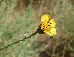 The inflorescence is made up of several short branches lined densely in small, thick, green bracts. The bracts are just a few millimeters long and are tipped with glands. At the ends of the branches are flower heads, each lined with phyllaries which are covered in knobby resin glands. Each head contains 9-25 disc florets which are yellow with black or purplish anthers. The head has a fringe of 3-7 yellow ray florets which often have lobed tips.[5]