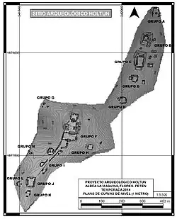 Holtun has been mapped three times since the first reconnaissance in 1994. The first version of the map was created in 1994 as part of the first approaching to the site.[18] The first survey reported 86 structures which were organized in four groups named with the literals A, B, C and D. The second map was created by the "Proyecto de Sitios Arqueológicos de Petén" (PROSIAPETEN).[19] It was a revision of the original map which resulted in the identification of 115 structures organized in 14 major groups.[20] The third map version was created by the Holtun Archaeological Project, which began the research in 2010. The project have been supported by the Department of Anthropology of Southern Methodist University . The map has been updated over three different mapping season, with the result of more than 200 structures identified and more than 27 chultuns.[21]