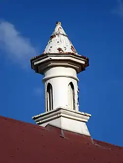 The wall separating the old wing from the 1899 brick addition has been removed to create one large ironing room. The extension was designed for maximum ventilation, and has a high ceiling lined with tongue and groove boards, tall sash windows and verandahs the length of each side, and large ventilators in the roof. The verandah detailing originally echoed that of the dormitory building, but the existing posts, arches and diagonal battening of the western verandah are mostly replacements suggestive of the original. The eastern verandah has been enclosed and remodelled.[1]
