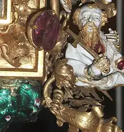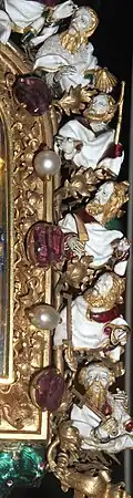 The reliquary exuberantly exploits the ronde bosse or "encrusted" enamelling technique, which involves creating small three-dimensional figures coated in enamel on a metal core, often just gold wire.[40] The technique was a recent innovation which the goldsmiths working for the Valois were pushing to its limits at the end of the 14th century. The main colour of enamel used is a lead-based white, which had also only been developed a decade or two at most before the date of the reliquary, and was evidently very fashionable at the end of the century. White dominates the few surviving large enamels in ronde bosse dated to the period beginning about 1380 and ending about 1410, used as here for both the clothes and flesh of the figures. Gold is used for their hair, and other enamel colours are mostly used at the neck and cuffs to demarcate between white robes and white flesh;[41] "throughout, colour is used in a very considered way"; "a controlled use of red includes the alternation of rubies and pearls", except where "a single sapphire interrupts this rhythm" above God the Father.[42] Blue, an important enamel colour in other works, is almost entirely absent here, perhaps so as not to overshadow the large sapphires.