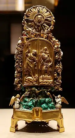 The Holy Thorn Reliquary was probably created in the 1390s in Paris for John, Duke of Berry, to house a relic of the Crown of Thorns. The reliquary was bequeathed to the British Museum in 1898 by Ferdinand de Rothschild as part of the Waddesdon Bequest.[1] It is one of a small number of major goldsmiths' works or joyaux that survive from the extravagant world of the courts of the Valois royal family around 1400. It is made of gold, lavishly decorated with jewels and pearls, and uses the technique of enamelling en ronde bosse, or "in the round", which had been recently developed when the reliquary was made, to create a total of 28 three-dimensional figures, mostly in white enamel.