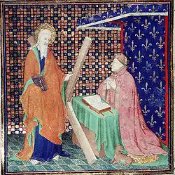 Jean, duc de Berry (1340–1416), or the "excellent puissant Prince Jehan filz de roy de France Duc de Berry" ("excellent and powerful prince Jean, son of the king of France, Duke of Berry"), as his secretary inscribed one of his manuscripts,[45] was the third of the four sons of King John II of France—Charles V, Louis I, Duke of Anjou (1339–1384), Berry and Philip the Bold, Duke of Burgundy (1342–1404). All commissioned great numbers of works of art in various media, and in particular spent huge sums on works in gold and silver. Although it is Berry who is especially remembered as a patron, partly because he specialized in illuminated manuscripts which have little value in their materials and so have not been recycled, his brother Louis of Anjou had over 3,000 pieces of plate at one point. These included wholly secular pieces with sculptures in enamel that can only be imagined by comparison as regards technique to the handful of reliquaries, like the Holy Thorn Reliquary, that have survived from the period, and as regards subject matter to tapestries and some secular illuminated manuscripts.[46] There are extremely detailed inventories of Berry's possessions including ones from 1401–1403 and 1413–1416, however none contain an entry whose description matches the reliquary.[47]
