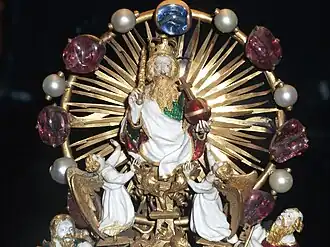 The jewels, which would have been keenly appreciated by contemporary viewers, include two large sapphires, one above God the Father at the very top of the reliquary, where it may have represented heaven,[15] and the other below Christ, on which the thorn is mounted. The gold elements framing God the Father and the central compartment with Christ and the thorn are decorated with alternating rubies and pearls, totalling fourteen of each.[16] All the gemstones have the smooth and polished cabochon cut normal in medieval jewellery, and though they are set in the reliquary with gold "claws", all are drilled through as though for threading on a necklace, suggesting that they are re-used from another piece.[17] There may have been other jewels now lost, for example mounted in two holes on either side of the door of the castle-like base.[18]