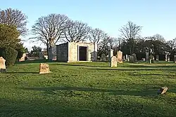 No trace of the church can now be seen, but its graveyard remains near Spynie Palace, and its site is occupied by two burial vaults, with a cross marking the location of the church's eastern end.[2] The graveyard is the burial place of former British Prime Minister Ramsay MacDonald.[2]