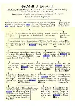 Records show that there has been a manor at Holywell since the 12th century or earlier and a well is still present beneath an old yew tree near the lake.[2] In 1575 Holywell was purchased by Robert Goodhall and later his family built a large L-shaped house of which the core and a gable end remain.[3] The Goodhall family were wealthy landowners and their pedigree chart is shown. By 1729 however they experienced financial hardship and it was decided to sell Holywell Hall. Lady Mary Barnardiston bought the property and gave it to her nephew Samuel Reynardson.[4] She also made him trustee of her very large fortune.