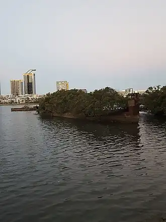 A number of ships' hulls are visible in Homebush Bay, remains of the ship-breaking operations in the bay during the mid-20th century. These are the steam colliers SS Ayrfield and SS Mortlake Bank, steam tugboat SS Heroic, and boom defence vessel HMAS Karangi, all broken up in the early 1970s and now lying near the south-western shore of the bay. Remains of a number of smaller abandoned or broken up vessel lie nearby.[14]