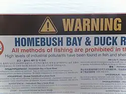The bay has a natural and artificial shoreline on the southern side of the Parramatta River between the suburbs of Wentworth Point and Rhodes. In the 1900s the bay was contaminated with dioxins and other chemicals by the local Union Carbide chemical plant, which has led to commercial fishing bans in most of Sydney Harbour, and health advisories about limiting the quantity of fish eaten from the Parramatta River. Other contaminants in the bay include phthalates, lead, polycyclic aromatic hydrocarbons, DDT, and heavy metals.[1] The eastern shore of the bay was remediated starting in 2008 to remove about 75% of the dioxins from the bay. Remediation was completed in mid-2010, however fishing is still prohibited in Homebush Bay.