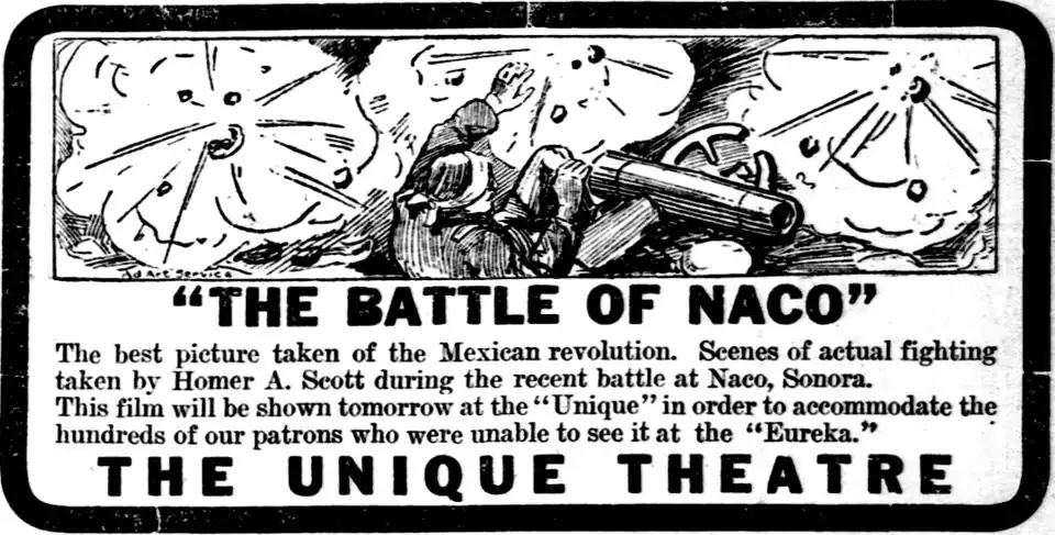 Little is known of Homer Scott's early work before 1911-1912, when he made several trips from El Paso, Texas into Mexico to photograph and film both sides of the Mexican Revolution. His war photographs were syndicated by Newspaper Enterprise Association, and he also furnished images for the New York Herald, Collier's, and Leslie's Weekly. During one trip, Scott was arrested and nearly executed as a spy.[2] His work is in major collections including the Getty Images and was included in an exhibition titled "Mexico: Photography and Revolution" in 2011 in Mexico City.