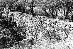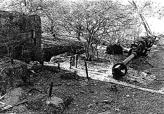 The battery site, situated on the northern bank of the dam, has been stripped of all buildings and plant. Remaining, are a broken concrete engine mount, concrete and aggregate foundations for twenty head of stamps, a twenty head camshaft with ten cams, and a beam pump arm.[1]