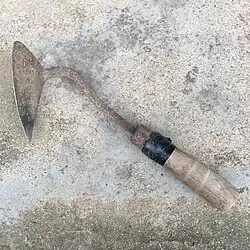 Homi (Korean: 호미), also known as a Korean hand plow,[1][2] is a short-handled traditional farming tool used by Koreans.[3][4][5] It is a farming tool that removes grasses from paddies and fields.[6] It is also used when plowing a rice field, planting seeds, plowing up soil, and digging potatoes in fields. It is a farming tool similar to the hoe. It is an important extension of agriculture from the ancient times because the homi was excavated in the Bronze Age historic site of the Pyeongnam Mangsan Daepyeong-ri and the early Iron Age historic site of Yangpyong, Gyeonggi Province.[7]