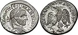 Strabo only mentioned Arethusa in his Geography, as a "very strong place" of the Arab Sampsigeramos and of his son Iamblikhos, "phylarchs" of the Emesene, who had allied themselves to Q. Caecilius Bassus against Caesar in 47 BC; the translators above cited have thought strange Strabo's not saying a word about Emesa.[33] Claims have been made that Emesa was founded by Seleucus I Nicator who established the Seleucid Empire upon the death of Alexander the Great. However, according to Henri Seyrig, Emesa does not seem to have received any Greek colony and the authors' complete silence makes one think that it did not increase its visibility under the Seleucid kings.[34] According to Henri Seyrig, it even seems that Posidonius, to whom Strabo probably referred concerning the Emesenes' phylarchs' alliance with Q. Caecilius Bassus, regarded the Emesenes as a simple tribe, governed by its sheikhs, and still devoid of a real urban existence;[35][c] according to Maamoun Abdulkarim, occupation of the citadel's tell does not confirm the existence of a real urban center in the plain before the Roman period and recent excavations have refuted the existence of vestiges preceding the Roman period under the actual town's outline, and the existence of an Arab Emesene dynasty in the region, probably located in Arethusa, attests to the secondary nature of this area during the Hellenistic period.[36] Upon Pompey's submission of the Seleucid state of Syria to the Roman Republic in 64 BCE, the Emesene dynasty were confirmed in their rule as client kings of the Romans for aiding their troops in various wars. At its greatest extent, the Arab kingdom's boundaries extended from the Bekaa Valley in the west to the border with Palmyra in the east, and from Yabrud in the south to al-Rastan (Arethusa) in the north. A marker at the Palmyrene's southwestern border was found in 1936 by Daniel Schlumberger at Qasr al-Hayr al-Gharbi, dating from the reign of Hadrian or one of his successors, which marked the boundary between Palmyrene and Emesene[37][38][d] (Pliny the Elder asserted that both territories were contiguous);[40] this boundary probably ran northwards to Khirbet al-Bilaas on Jabal al-Bilas where another marker, laid by Roman governor Silanus, has been found, 75 kilometres (47 mi) northwest of Palmyra, probably marking a boundary with the territory of Epiphania.[41][42] The kingdom of Sampsiceramus I, was the first of Rome's Arab clients on the desert fringes.[18]